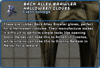 These are rubber Back Alley Brawler gloves, perfect for a Halloween costume. Their manufacture makes it difficult to perform simple tasks like opening doors. Heroes can take this to Annah in Croatoa, while villains can take this to Granny Beldam in Nerva, for a reward.