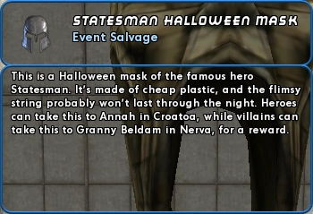 This is a Halloween mask of the famous hero Statesman. It's made of cheap plastic, and the flimsy string probably won't last through the night. Heroes can take this to Annah in Croatoa, while villains can take this to Granny Beldam in Nerva, for a reward.