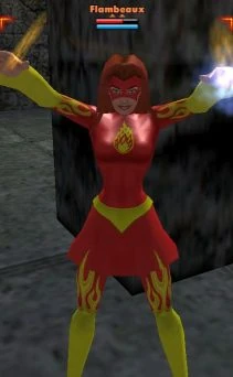 Flambeaux is a fiery-haired hero who developed a process to turn her body energies into biochemical fire she can project at her enemies.